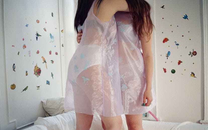It’s a very rainy Tuesday night in New York and Me and You designers Julia Baylis and Mayan Toledo are running around Dossier Outpost, wearing matching white schoolgirl skirts and white tees that proudly read “Feminist,” The T-shirts, just like the Me and You undies lying on a pile nearby, are showered with red-lipstick’d smooch stains. At the other end of the room, friend and collaborator Petra Collins is chatting away with gallery-goers, fans and friends alike. The brand’s first lookbook, shot by Collins, stares from the walls in all its candid girliness, one First Response pregnancy test wrapper at a time. Amidst the room lays artist India Salvor Menuez on a single bed, one hand on her chin, tending to the music. The dimly lit room itself could easily get mistaken for a teenager’s bedroom in the middle of Lower Manhattan: Plates of pink-glazed sprinkle cookies – ghostly remnants of a sleepover that never happened – lay here and there. The air is filled with the new brand of feminism that surrounds Tavi Gevinson and her online zine Rookie; that of creative young women who work together in a sense of community and do what comes naturally.