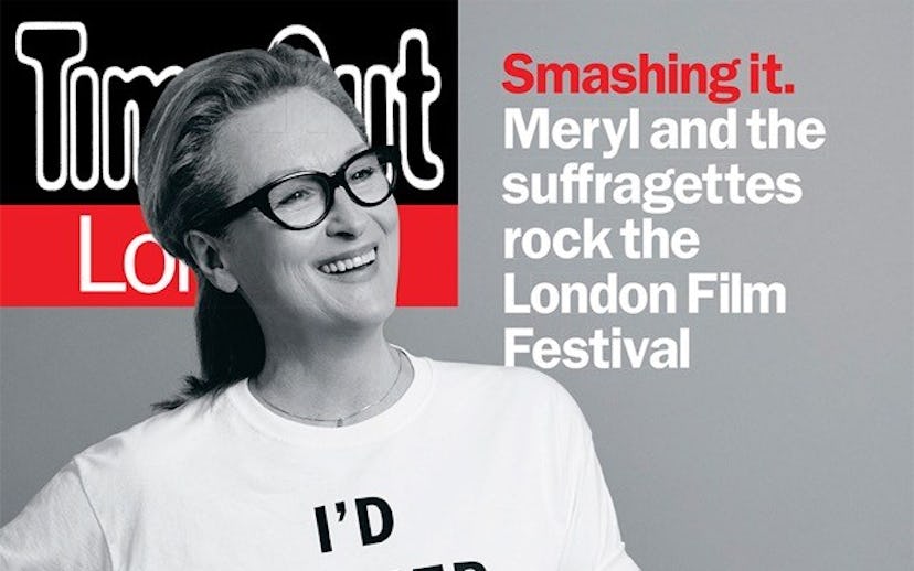 While promoting her new film Suffragette, Streep and the rest of the film's cast wore T-shirts emblazoned with a quote from Emmeline Pankhurst, the British political activist Streep plays in the film. "I'd rather be a rebel than a slave," the T-shirt reads in bold black lettters. Taken in the context of the film, the quote is meant to inspire women to fight for their right to vote. But any time a white woman invokes the word slave, it becomes instantly problematic.
