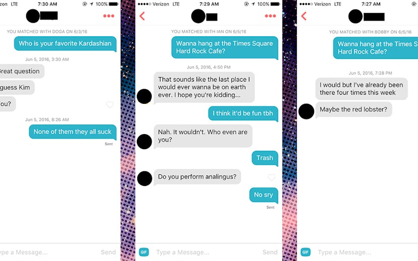 If SXSW could be characterized by its intensity, and Boston Calling by its intimacy, Governors Ball 2016 shall be known for its Kanye riots. When the third and final day of Governors Ball, held June 3 on Randall’s Island in New York City, had been cancelled due to severe weather predictions, rumors on where Kanye would pop up began to circulate. My goal was to wait out the storm at the Times Square Hard Rock Cafe, the place where dreams either come to life or to die. Of my 45 matches, no one seemed up for the challenge quite like Ryan*. Within a matter of a few message exchanges and 45 minutes, we were sitting at the bar sipping margaritas and discussing his famous actor cousin who happened to star in a movie alongside Zooey Deschanel. Despite having spent years living in New York, Ryan still liked coming to the Hard Rock Cafe and enjoys their nachos—it’s an office tradition, he said. He also claimed he’d never seen Grease before, yet knew every word to the medley that played on the speakers overhead. We gazed into each other’s eyes as we sang “Those s-u-u-mmer nights,” and I thought it could be love.