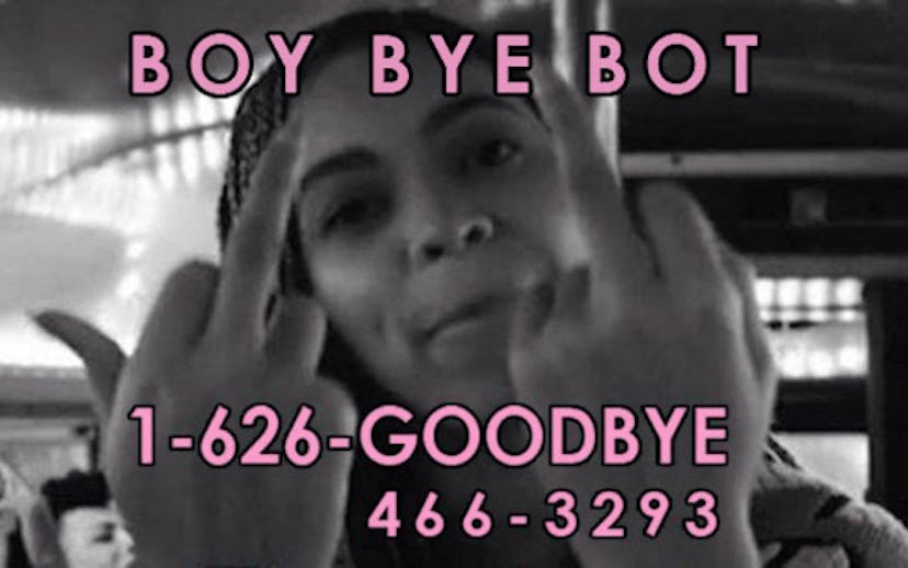Similar to Jonah and Chelsea Perretti's Rejection Hotline in 2002, a number that went to a recording informing the person you're not interested, Boy Bye Bot was created by comedian Hassan S. Ali, who got the idea while talking to a group of female friends who were complaining about some of the more aggressive and disgusting messages they've received from men. So far, Ali's said, the messages he's read have been 50 percent hilarious and 50 percent sad. Sounds about right.
