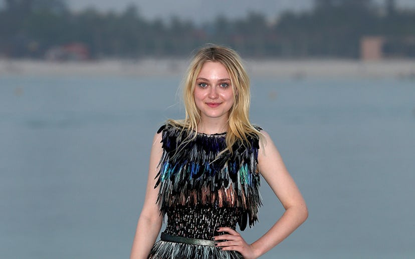While her sister Elle keeps it light and princess-like for her Maleficent tour, Dakota Fanning looks like she took a cue from the dark queen herself. At the Chanel Dubai show, the actress channeled her inner phoenix and rocked this rainbow feathered haute couture dress from the iconic French brand.