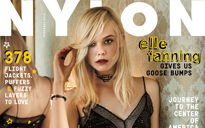 Fanning first appeared on screen at age two, as a younger version of the character played by her older sister, Dakota, in I Am Sam. Since then, she has appeared in more than 30 films, an already staggering number that’s rapidly increasing. This year alone, she plays the title role in About Ray, a film about a transgender teen, alongside Susan Sarandon and Naomi Watts, and Bryan Cranston’s daughter in Trumbo, the story of a Hollywood screenwriter blacklisted as a communist. Both are high-profile projects with complex, grown-up roles that firmly establish her as an adult actress. To say that it’s a big year is an understatement.