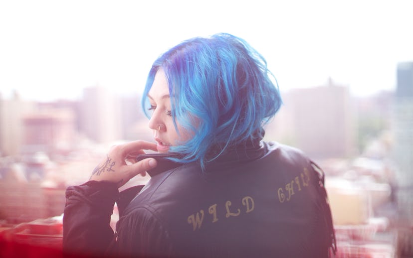 I’ve never seen someone light up a room quite like Elle King: The 27-year-old country-rock-pop singer bear-hugs me when I open the door to the Ludlow Hotel suite in Manhattan where we’re photographing her, grinning from ear to ear and clutching a sugar-free Red Bull as her big blue eyes (beneath matching blue hair) scan the room. “Do you mind if I have a cigarette really quickly?” she asks. This habit explains that charming rasp of hers, but the roughness in her voice is also a side effect from her performance just a few days ago at the Sturgis Motorcycle Rally in South Dakota, where she opened up for Lynyrd Skynyrd.