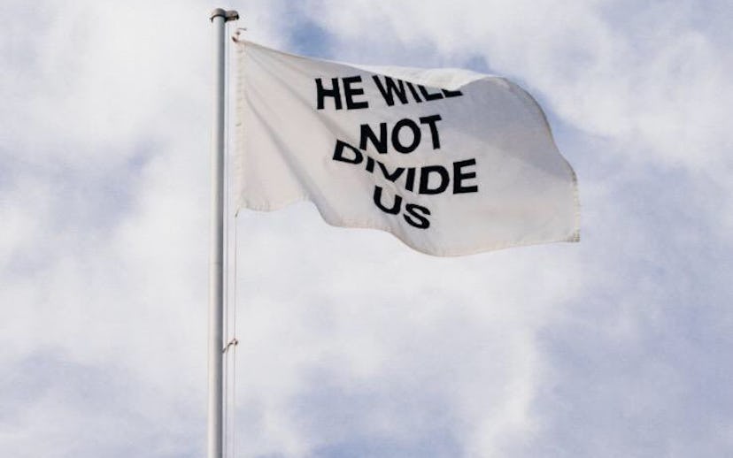 The latest format shows a white flag that reads "he will not divide us" in black all-caps letters. The HEWILLNOTDIVIDE.US website states that the flag will be flown for the duration of Trump's presidency. While you can't hear anyone chanting the mantra at this current time, there are some birds chirping in the background.