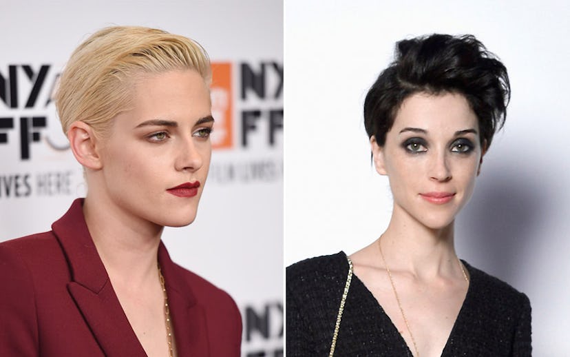 Let's take Kristen Stewart and St. Vincent's Annie Clark. They are the latest duo to generate dating headlines because they simply shared space together. Stewart is in New York City doing the New York Film Festival thing and Clark has joined her at a few carpets. They then walked around the East Village together during a nice New York afternoon filled with sun, lunch, and lessons in transitional rockstar fantasy garb. By Hollywood standards, this means they're dating. And if that's the case, I would be dating many of my coworkers at once because I, too, have been spotted walking around New York, grabbing lunch, and generally sharing space with many of them, sometimes one-on-one, and sometimes in a group. (Sorry you all had to find out this way, guys. Never my intention!)