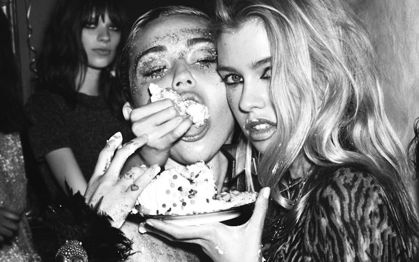 In an upcoming, NSFW fashion spread for W Magazine, Miley Cyrus and her model girlfriend, Stella Maxwell, posed for a wild, '80s-themed party, complete with glitter, shag carpets, and freed nipples. In one photo, a topless Cyrus is being fed cake by Maxwell. The spread was photographed by Mert Alas and Marcus Piggot and styled by Edward Enninful, and it features other industry names like Joan Smalls, Paris Hilton, and Asia Chow.