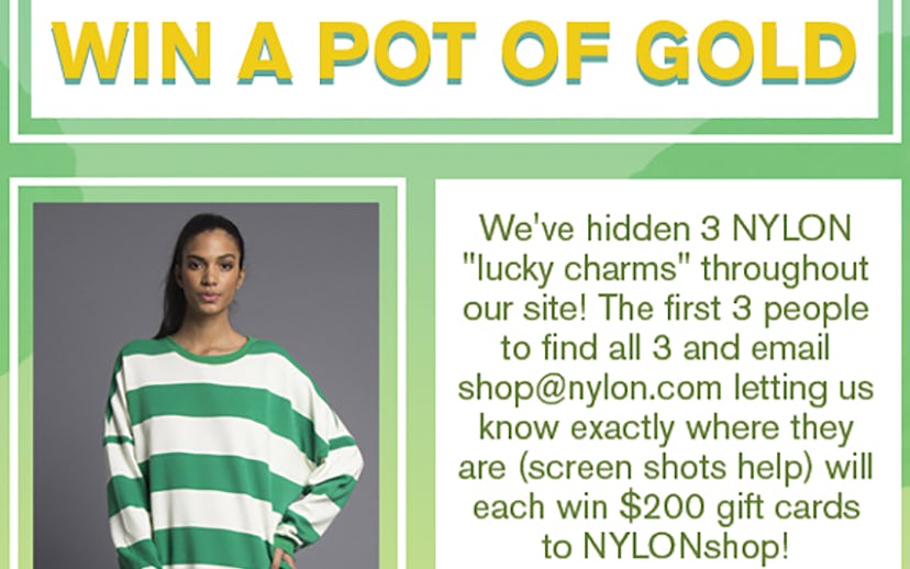 Not Irish? No problem. This year, we're giving everyone a reason to celebrate St. Patrick's Day. We're letting three lucky winners strike a big ol' pot of gold at the end of the rainbow by giving away three gift cards worth $200 to NYLONshop. Make your friends green with envy with your stylish new items. Talk about a perfect way to start prepping your spring wardrobe too.