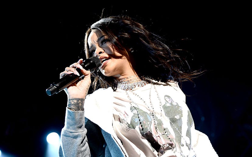 In the video, the newly political RiRi splices together clips of 9/11, MLK Jr., the Ferguson riots, and global warming while she remixes the Star Spangled Banner. This heavy stuff is a huge departure for an artist who isn't exactly known for her political statements (unless you count her support of #freethenipple, of course). What her message actually is, though, seems mixed. Is she for this new America? Is she not? Has Rihanna gone full philosopher and suggested that there’s no way to escape the vicious paradox of the “American Dream”?