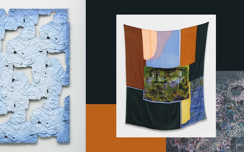 Lauren Luloff's silk paintings reveal a masterful wistfulness, as flora, trees and bodies of water are her primary muses. Luloff recently pivoted away from painting bleach on bedsheets, and her new paintings on silk, shown earlier this year at Ceysson & Bénétière in Paris, are generative, brighter, more chromatic and sweeping, while maintaining her wellspring of inspiration (blooms, stems, leaves, branches, reflections) and signature textile balance. Various patchworks of silk are sewn together, mounted and composed as sculptures, either propped on two legs of wood, framed or hung as tapestries. In her silk paintings, inklings of plant classification and ambiguity intermix, and a spirited charm of nature comes across. As plein air paintings, the work conveys enchantment, with inferred traces of Luloff's daily footsteps to her chosen landscapes and far-in-between patches of solitary spaces. Luloff's work is intensely meticulous, with brightly executed landscapes and explorations of plant-forms that become botanical, sprouting totems. These totems sit like austere bait, and each has a quiet, chromatic life-stir that is both earthy and ethereal. Earlier this summer, Halsey McKay Gallery, in East Hampton, offered a presentation of Luloff's small scale paintings, and her paintings on silk were included at Derek Eller Gallery, in New York, alongside stunning works by Clare Grill and Kathia St. Hilaire.