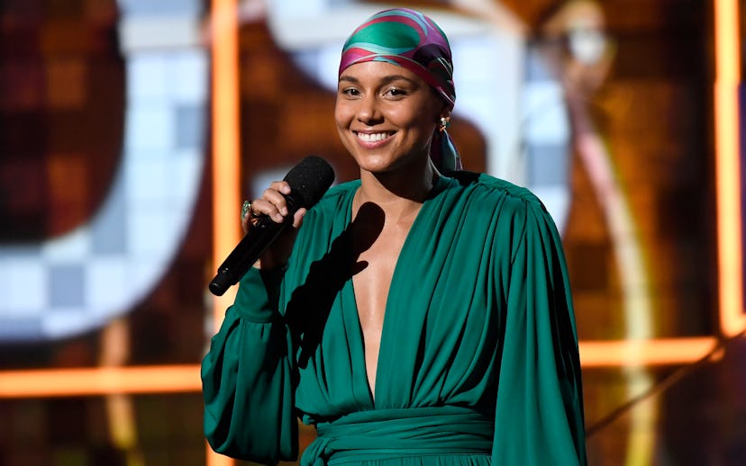 Alicia Keys may be hosting the biggest night of the year for the music industry, but that doesn't mean she was about to sacrifice comfort. Opposed to the usual glitz and glamour of the red carpet, Keys opted for a flowy green jumpsuit and printed silk headscarf with her signature lack of makeup.