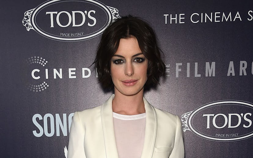 At the premiere of her new film Song One—about a woman named Franny (Hathaway) who returns home after her younger brother becomes critically injured and falls in love with his favorite indie musician (Johnny Flynn) along the way—Hathaway wore a super-cool, mixed-texutre winter white ensemble. With a dark, smoldering smoky eye, glossy lips, and a longer, grown-out tousled bob, Hathaway pretty much mastered the whole "sexy, easy-going, mature indie scenester" look. So, yeah, we want to be just like Anne Hathaway when we grow up.
