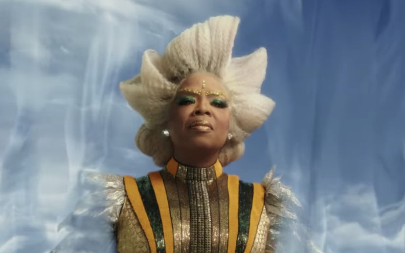 Beyond how interesting the film's narrative looks, though, it was hard not to notice how interesting many of the character's hair and beauty looks are—like, we're feeling seriously inspired by the three celestial guides who aid our heroine along her voyage. It helps that these guides—more like goddesses—are played by a Titian-headed Reese Witherspoon, as Mrs. Whatsit; Mindy Kaling, as Mrs. Who; and Oprah Winfrey, as Mrs. Which. Each sports a statement hair and beauty look worthy of replicating whether you live on planet Uriel or planet Earth. Mrs. Which is bringing back golden glitter brows, with accompanying rhinestone forehead jewels, while Mrs. Whatsit's copper metallic eyeshadow makes for a strong monochromatic look along with her fiery orange hair. And Mrs. Who? Well, her sometimes present, sometimes absent bangs look is making us even less certain about growing bangs for the hundredth time, but we'll forgive her, because she looks so amazing.