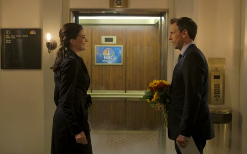 Romantic comedy parodies are well-trodden territory, but last night Seth Meyers had a fresh take with some help from Anne Hathaway. Spoofing the end of pretty much every rom-com ever, Meyers raced after Hathaway through the halls at 30 Rock, and after several near-misses, catches up to her just in the nick of time. We won’t spoil the punchline, but you can probably guess that it ends happily ever after.