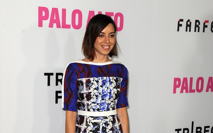 As far as the general dictum goes, the more the merrier. When it comes to Aubrey Plaza's blue printed dress, we have to say we agree. It's violet on the top, snakeskin in the middle, and pretty awesome for a summer day all over.