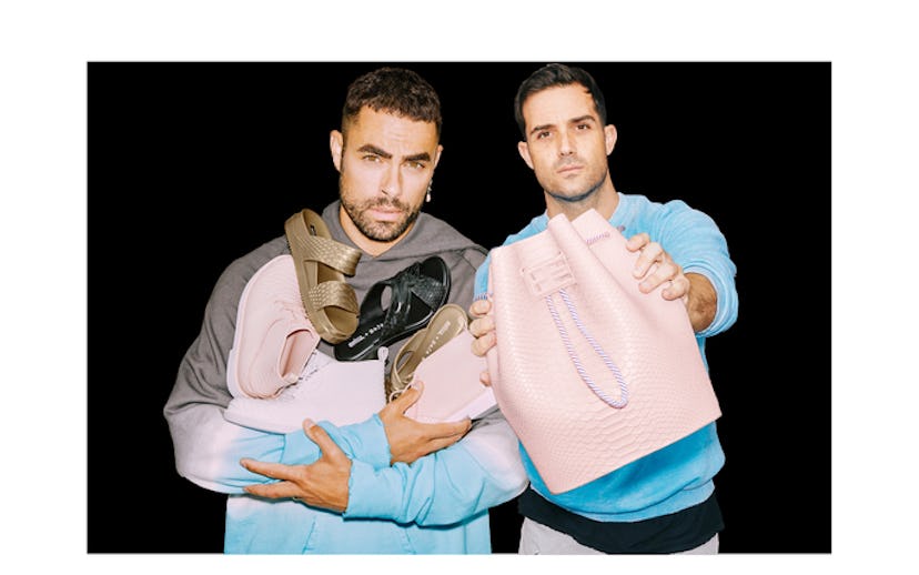 The result includes four versatile footwear styles—slides, sandals, a mule, and a lace-up ankle bootie—and one drawstring bucket bag in a color palette of millennial pink, black, white, and gold. "The styles we designed replicate how we approach fashion—it had to be playful. Our beach slide is emblazoned with the word 'Thriving' across the shoes, and we also created a cool print that we refer to as 'psychedelic tiger,'" the duo says. "Each style is different, but they each feel fresh, accessible, and fun."