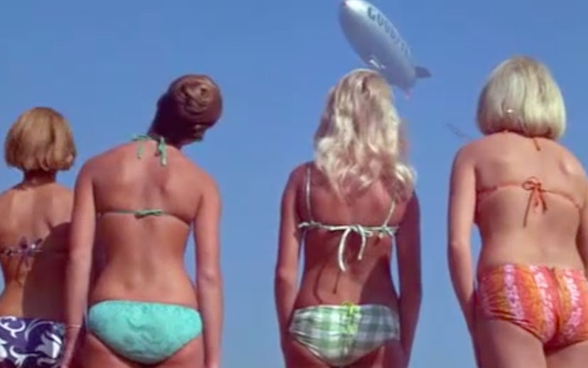 Bikinis are obviously of the utmost importance. The end credits even have a special "Swimsuits by" credit (shout out to DeWeese Designs of California!) The loveliness of DeWeese's designs really comes through in group shots. The bikinis are candy colored and look like the kind of thing you could buy from ModCloth today. They all have the same cut—structured top and low-cut yet full-coverage bottom—and with the slight variations in color and pattern, the spectacle recalls a contemporary girl group in their coordinated outfits.