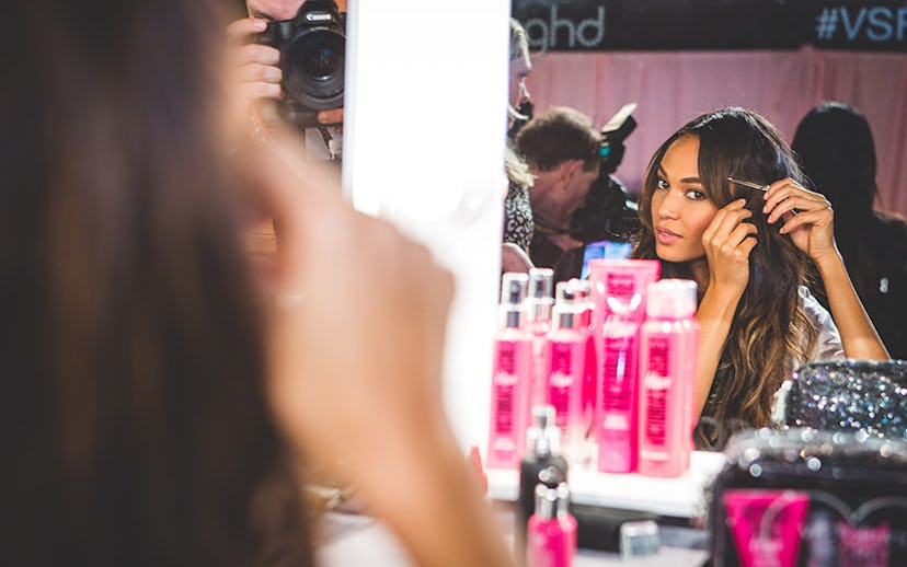 With 47 models, 81 outfits, 39 pairs of wings, and two Fantasy Bras going into the 2014 Victoria’s Secret Fashion Show, you could expect there to be, oh, just a little bit of a frenzy happening backstage. Candice Swanepoel needed eye drops; Joan Smalls needed water; Lily Aldridge needed the ladies’ room. Through the scrum of photographers and press, you could see Doutzen Kroes sneak off with a salad, while her fellow Angels took turns spray-painting a mural devoted to London. The makeup tables were covered with backup hair extensions in every hue, plates of picked-at fruit, and jars of Charlotte Tilbury Magic Cream. The models themselves donned pink slip robes, and managed to smile—or at least selfie—through it all.