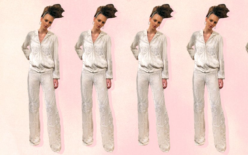 If you've just started getting on board the wedding jumpsuit train, get ready to disembark and switch tracks. The bridal tracksuit is here, and it's giving the bridal romper a run down the aisle.