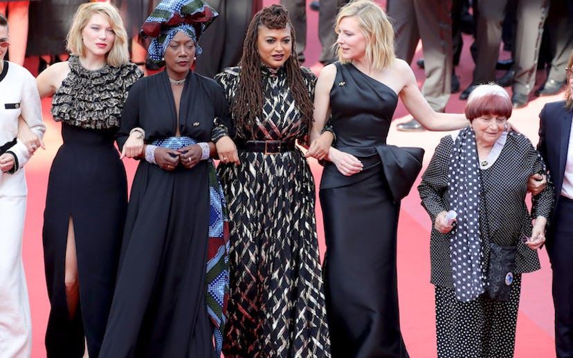 Marianne Slot, Haifaa al-Mansour, Kristen Stewart, Léa Seydoux, Khadja Nin, Ava DuVernay, Cate Blanchett, Agnès Varda, Céline Sciamma, and Jeanne Lapoirie walk the red carpet during the premiere of Girls Of The Sun (Les Filles Du Soleil) arm-in-arm, protesting the lack of female filmmaker representation throughout the history of the festival. Have you ever seen a more badass (and sartorially pleasing) girl squad?