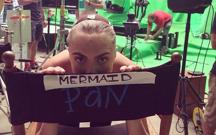 Leave it to Cara Delevingne to give the first unofficial look at the new Peter Pan film adaptation, courtesy of —where else?—her Instagram. The model and budding actress posted a photo today, posing in her chair (that's stamped with "Mermaid," hinting that she'll be taking on that role for the flick).
