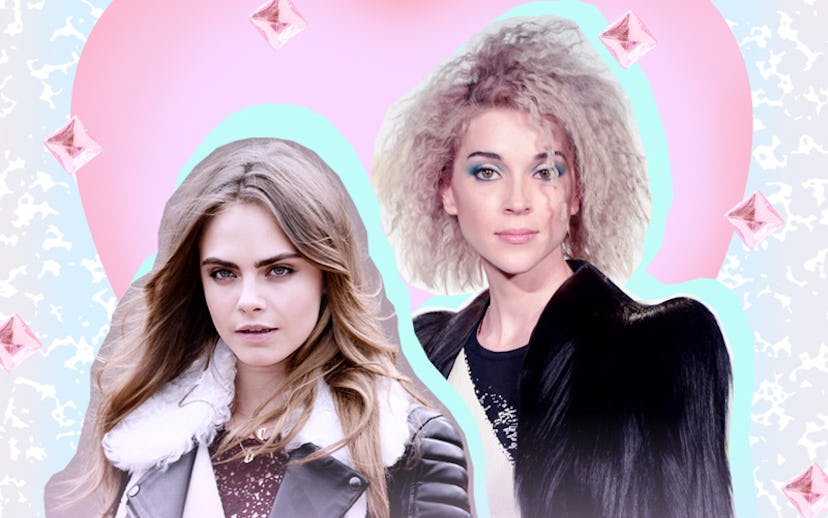 In a world where cool supermodels have eyebrows for days and equally beautiful musicians have wild hair and elfin cheekbones, we bring you this rumor: Cara Delevingne might be dating Annie Clark (St. Vincent). Or at least, she may be smooching her. They were allegedly seen kissing at the BRIT Awards Afterparty, and were then seen leaving together (according to the Daily Mail). Obviously this could mean anything. Maybe they were just rubbing their faces on each other like kittens. Maybe they are just friends who like to kiss when they get drunk. The only thing we know is that we are all lucky such attractive people can come into contact with one another without the world just exploding.
