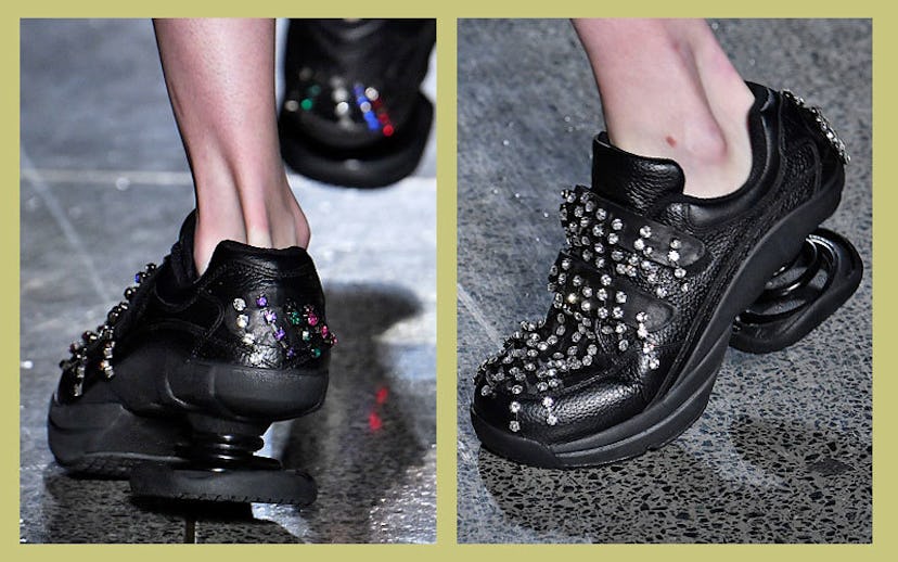 So be ahead of the trend. Set yourself a Google alert for when these Christopher Kane sneakers hit the market. They're designed with Z-CoiL's spring heel technology that, according to Z-CoiL's site, helps reduce back, neck, and foot pain through its shock-absorbing heel cushion. Christopher Kane bedazzled the front and added some of-the-moment velcro ties, which will likely raise the OG's $300 price point to something, like, $500 because glitter, proper posture, and ease come at a price.