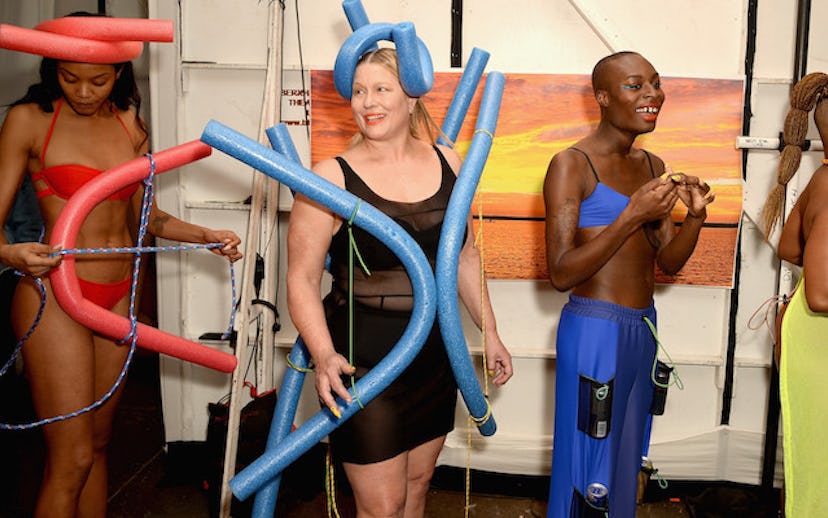 Of course, the beauty was also chock full of aquatic inspiration. An unkempt splash of cerulean blue was swiped under the eyes by Fatima Thomas for M.A.C, while bungee cord headbands and enormous teased and bunched ponytails were created by Kien Hoang for Oribe. Nails by Eda Levenson of Lady Fancy Nails for Chillhouse and CND included pool noodle and bungee cord-inspired paint jobs.