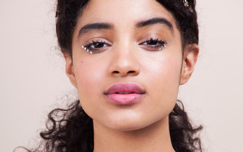 To set the stage for this sparkling look, use a light pink stain on both your lips and your cheeks. Then, use an eyelash glue to adhere crystals below your lash line. Go as crazy or as minimal as you want—either way, you’ll shine bright like a… oh, you know the rest.