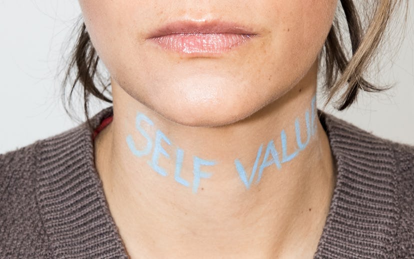 With that said, when we went backstage at Collina Strada to see what was in the works for this season, it was refreshing to see color—and lots of it. Makeup artist Colleen Runne for 100% Pure and Plantioxidants swept baby blue shadow on the lids of each model, a pop of pastel color not usually associated with a season known for its earthy neutrals and subdued hues. This same icy blue shade was used again, in the form of hand-drawn “tattoos.” Powerful qualities, such as “self-value” and “self-love,” were scribbled across some of the models' necks, with others donning hearts outlining their eye sockets.