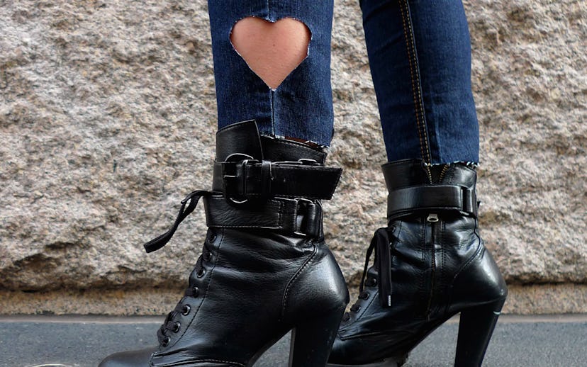 Since that fateful day, we've been brainstorming how to make our own cut-out pants. With some jeans from Bongo and some very sharp scissors, we took matters into our own hands and DIYed three different designs: a heart, an arrow, and a zig-zag. Don't worry, we'll show you how to do it to with our handy DIY guide. You can rock your cut-out pants bare legged or on chilly days like today, add some bright socks for a little peek-a-boo action.