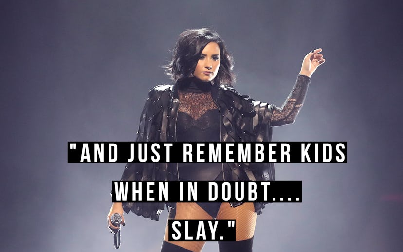 Her music has become a vehicle for self-empowerment. Songs like "Confident" put a pop spin on the age-old question of "What's wrong with being feeling yourself?" Others, like "Stone Cold," embrace vulnerability. Her recent naked and makeup-free photo shoots bring the conversation around body positivity to the forefront of the media world and dinner tables across the globe. There isn't a light quite as bright, as outspoken, and as unique as Lovato's. Here, we celebrate this outspokenness with her 10 best quotes.