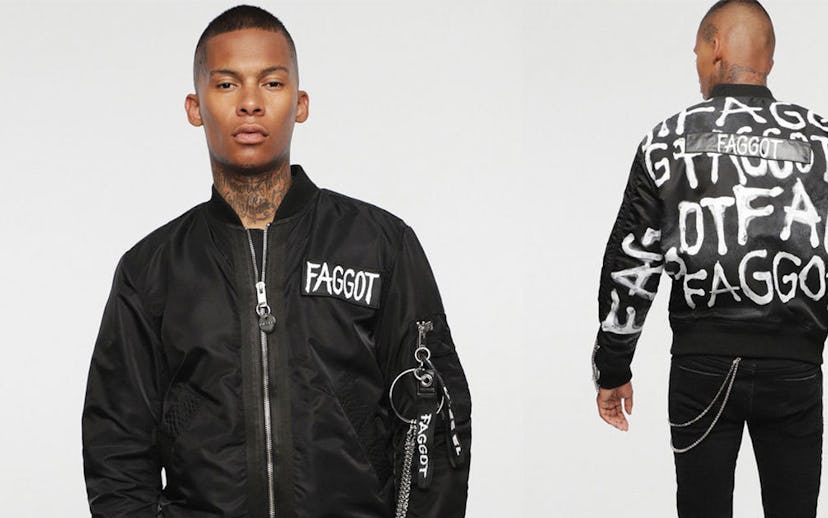 The item, which appears to only be available on the brand’s U.K. site at the moment, is a satin bomber with a homophobic slur that appears on both the front and back. The description explains: “This bomber jacket is crafted from shiny technical satin. It features gathered sleeves, a quilted interior lining and two straps which allow you to wear it like a backpack. It's embellished with a canvas stripe on the front with the comment ‘FAGGOT’ and with an all-over print and a removable label on the left shoulder with the same comment.”