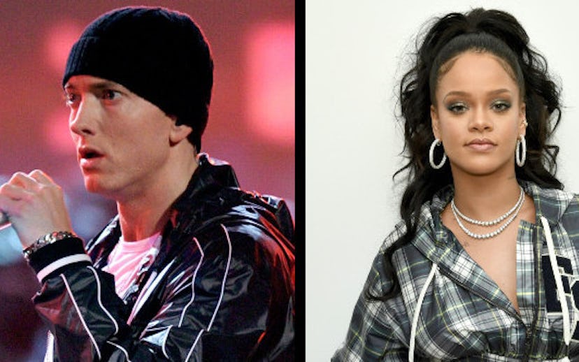 In response, MGK released "Rap Devil," which brought Em's friend and collaborator, Rihanna, into the mix by claiming that Eminem's "the type to be scared to ask Rihanna for her number." Eminem's response? A line on "Killshot" that goes, "Rihanna just hit me on a text/ Last night I left hickeys on her neck." Obviously, this bold declaration has led many Rihanna stans to freak out.