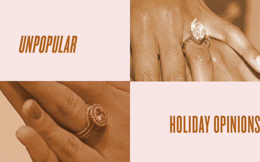 And, also, maybe this is just the weather at work: There’s a reason the winter is also known as cuffing season, and that's because it's cold out there. The frosty weather lends itself well to having someone to cozy up next to, while the holidays provide an illusion of euphoric, twinkling bliss. It’s easy to get caught up in the magic of it all and find yourself on one knee in front of a tree. It’s easy to make a holiday meant to be about giving back all about you.