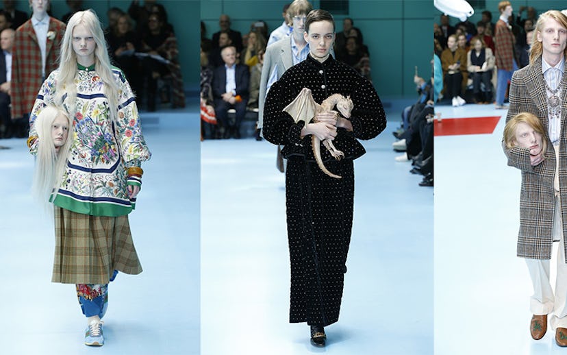 Possibly the most viral element of the show was that, in lieu of handbags, a handful of models carried creatures, like a baby dragon or a snake or a chameleon. These wild accessories, as well as those model heads, are all thanks to Makinarium, a Rome-based factory that produces these bespoke special effects and replicas for films and other projects.