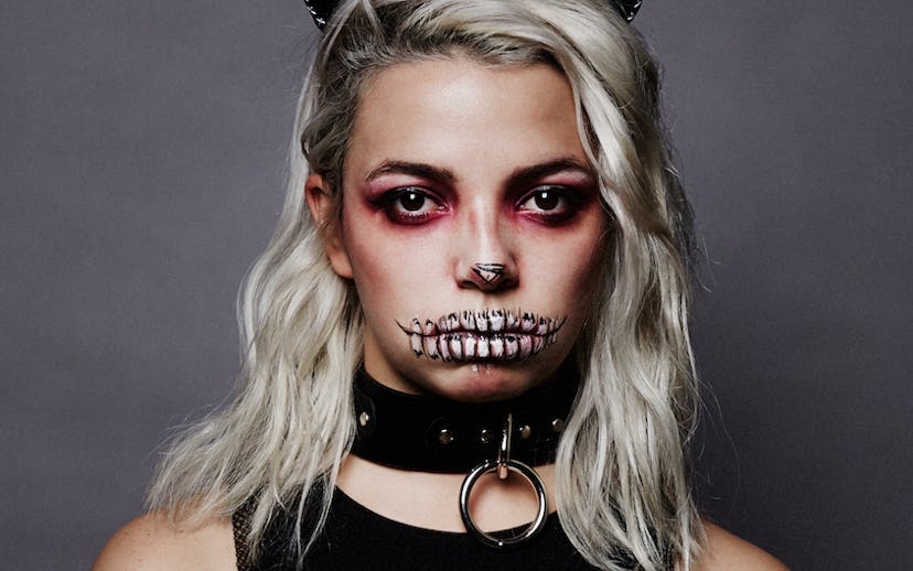 The “horror” comes in the form of the grin. Using black face paint, Tulve suggests outlining the mouth first before filling in the teeth with white face paint. Go as accurate or as sketchy as you want! This look is meant to be a little wrangled.
