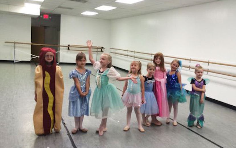 Internet, say hello to your new, hot dog-shaped overlord. Over the weekend, a little girl showed up to her dance class' Princess Day dressed as everybody's favorite tubular encased meat. So, while her friends did their best Elsa and Cinderella impersonations, she chose to go the road less travelled—the road of ballpark snacks. Though the more likely scenario is that our tiny hero is an Adventure Time superfan, as the show has on several occasions featured Hot Dog Princess, ruler of the Hot Dog Kingdom. After photos of the girl surfaced online, they quickly went viral, and before long, #hotdogprincess was trending on Tumblr and Twitter.