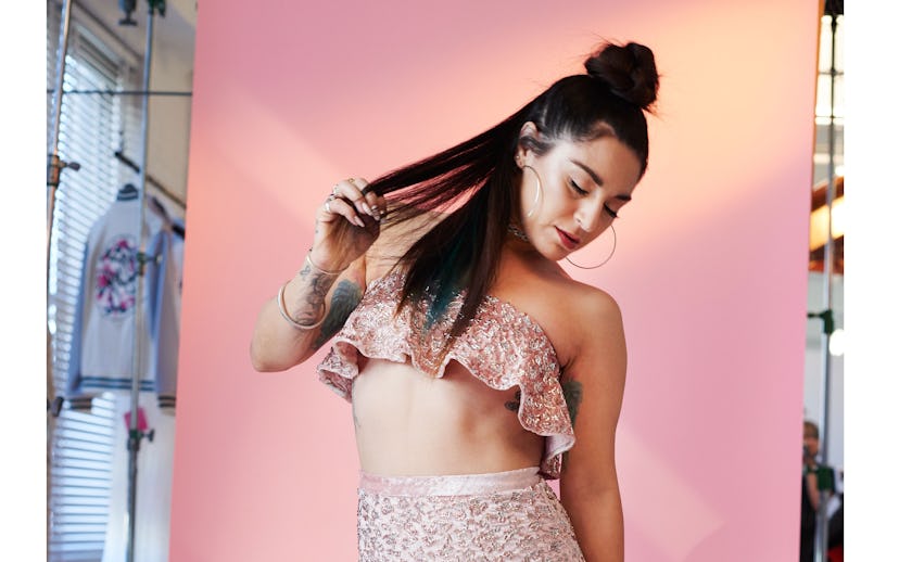 As for the collection, christened “Not Your Baby,” it was a similarly collaborative effort; Polk designed the looks with each unique woman in mind, also working with Lulu Frost on a custom capsule line of chokers and earrings for the film. Featuring Houghton’s quintessentially edgy and modern looks, perfect for the non-run-of-the-mill brides looking to stand out on their wedding day, this season saw a slew of metallic gowns, high-low pastel tulle skirts, overalls, an embroidered sequin bandeau, and a cashmere wide-leg pantsuit in addition to a selection of slogan sweaters and jackets (emblazoned with bold statements like “Fuck Boy,” “Hopeless Romantics,” and “Houghton Girl”). An intensely free-spirited aesthetic is at the core of the collection yet again, making it a perfect fit for the bride who marches to the beat of her own nuptial drum. After introducing a “Buy Now, Wear Now” collection at their last show, in another until-then-unprecedented move, certain pieces from the Fall/Winter 2017 line—notably including the limited-edition “Not Your Baby” silk baseball jacket that all 10 women were wearing at the screening—have similarly become available to order online following the event.