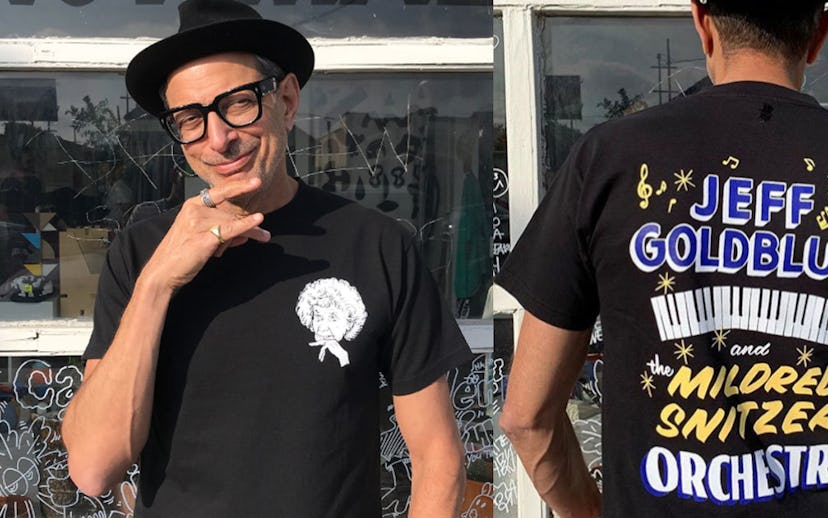 In collaboration with L.A. store Virgil Normal, Goldblum is offering two t-shirts, one black and one white. Both feature Mildred Snitzer, the Silicon Valley centenarian the jazz band is named after, on the front and a retro concert poster design by She Chimp on the back.