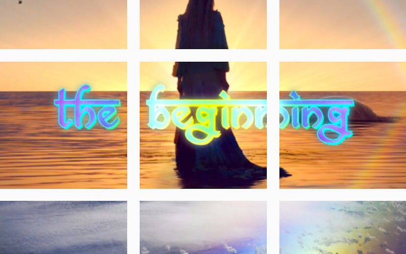 Since filing a lawsuit against Dr. Luke in October 2014, Kesha hasn't been able to share any new music. She has talked about the songs she's sitting on, offering up the ever-reliable response of "soon," but that could mean anything. Today, however, Kesha unfollowed everyone she was following on Instagram and uploaded a series of 15 images that, when viewed zoomed-out, create a sublime image of clouds, rainbows, desert, and the ocean. Kesha is seen from the back, silhouetted against the sun with the phrase "the beginning" printed over her in an enigmatic font.