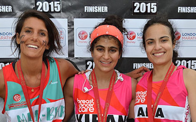 Following the race, Gandhi proudly posed for photos with her friends and family in her stained running outfit. “If there’s one way to transcend oppression, it’s to run in a marathon in whatever way you want,” she wrote of the experience. We couldn’t agree with this sentiment more.