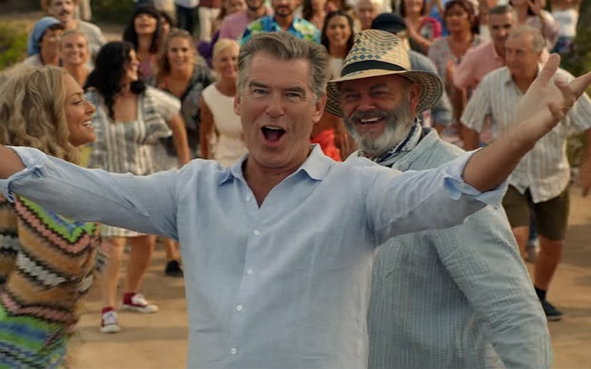 Brosnan’s moment of triumph comes around the 65-minute mark of the original film. His character, Sam, is lamenting his lost relationship with Donna (Streep), the woman whose daughter’s mystery dad drives the movie’s plot-jalopy. Sam and Donna express themselves by trading verses on ABBA’s song “S.O.S.” The key lyric—“When you’re gone/ How can I even try to go on”—has become nearly as much of a Brosnan signature as “shaken, not stirred.”
