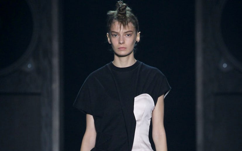 1. Models' hair (crafted by famed stylist Guido) was inspired by '90s Bjork. Think four tightly-wound mohawk knots along the top of the head, but leaving the end pieces of the buns sticking out for a "danced all night" effect.