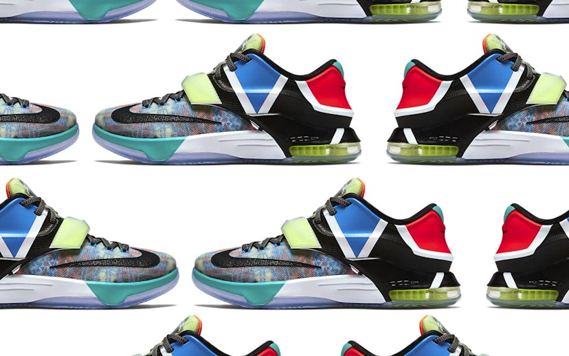 With on-court aesthetics influencing player-designed sneakers, Kevin Durant's KD 7 always grabs our attention with a cop-worthy pair. Nike has unveiled the Nike KD 7 "What The" as a continuation of the traditional "What The" sneaker collection, which—you guessed it—leaves consumers saying "What the F***?" The sneakers are notable for their vibrant clashing colors and patterns. Some notable touches on the KD 7 "What The" are the glow-in-the-dark elements on the back heel, translucent straps and outsole, and accents of neon glow. The colorfully patterned carbon fiber body also makes for a loud summer shoe if one so needed. The KD 7 "What The" will be available at select Nike retailers on June 20th.