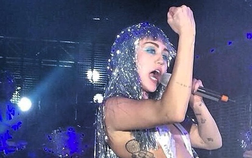According to Yahoo! News, Cyrus opened up about the past year, saying that her experiences (like the 2013 MTV VMAs and the death of her dog) led her to a dark place. "This year has constantly challenged me, and that's why I started doing art," she said. That art, as you may remember from her Dirty Hippy debut, is mostly 3-D glue-gun sculptures of beads, teddy bears, and car air fresheners. Cyrus then performed a "macabre" song before transitioning to more upbeat songs. During her performance, she wore a massive rainbow cutout on her head, made it rain confetti, and smoked weed on stage: "Usually I don't smoke weed and drink, well that's a lie ... usually I don't smoke weed and drink on show days, but I felt like it was fine in Miami," she said.