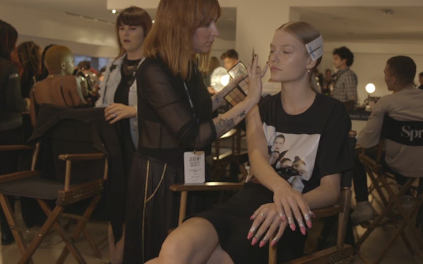 "To get this look, you do your spirit gum or eyelash glue, you take a paintbrush, you dip it into loose cosmetic glitter—which is important because it's not toxic, so if you eat a sandwich, you're good," Miss Pop tells NYLON assistant digital editor Jenna Igneri. "And you just stroke it down, and as you streak down, it will naturally fall and set into the glue. And it'll last all day and all night, which is probably when you want it to last—all night."