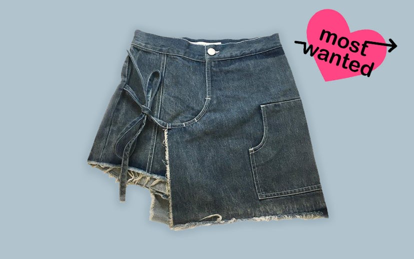 This denim skort by Sandy Liang is #denimgoals. The silhouette is different than that the iconic denim mini skirt, since the side that wraps around is longer than the side where you can see the shorts.