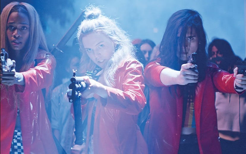 Written and directed by Sam Levinson, Assassination Nation stars Odessa Young as protagonist Lily, an 18-year-old student at East Salem High who's secretly cheating on her dipshit boyfriend via sexts with an older mystery man. At the start of the movie, Lily—along with her three best friends, Bex (Hari Nef), Em (Abra), and Sarah (Suki Waterhouse)—is just your average, social media-obsessed teen. But their lives change when an anonymous hacker begins targeting community leaders in the town, and suspicion falls on Lily and Co.