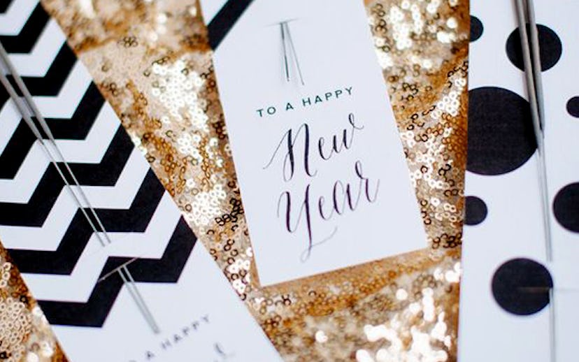 For starters, it’s all about glitter, and all things gold. From twinkling lights to sequined party hats to balloons of all shapes and sizes (champagne bottle-shaped included), gold, black, and white are the color palette of choice for ringing in the new year. Of course, don’t forget to set up a killer photo booth backdrop for memories that last beyond the stroke of midnight.