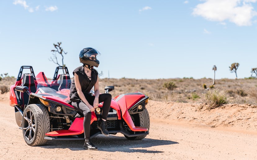 I saw the terrain of the Southwest in a completely new way and caved to the romanticism. I enjoyed the roar of the engine on barren roads that hugged cliff sides; I drank in the scenery. The overripe peach tones of plateaus, chalky greens of rolling brush, and gnarly, Dr. Seuss-like profiles of desert trees stretched out for miles, without a single man-made building in sight. On these back roads, there is the sense of being able to see the whole of the world stretched out before you, and driving it in a Slingshot, with its openness, its ferocity, and, perhaps most importantly, its demand for attention (no checking makeup or taking phone calls the way you would in a car), there's a definite Zen-ness attained.